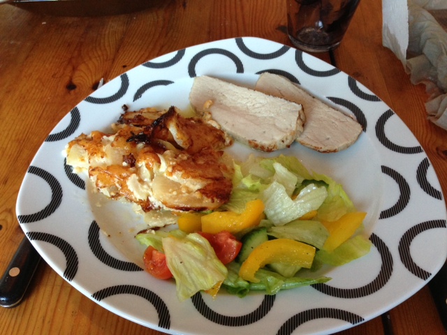 Jag bestämde mig för att servera den till helstekt fläskytterfilé och en sallad. Den var otroligt ”såsig” när jag ställde in den i ugnen så jag gjorde ingen sås, men det ångrade jag sedan för vätskan kokade in i gratängen. Den blev krämig ändå, och köttet var mört och fint (jag helstekte det i en stekpanna med lock) men en sås till hade inte skadat!